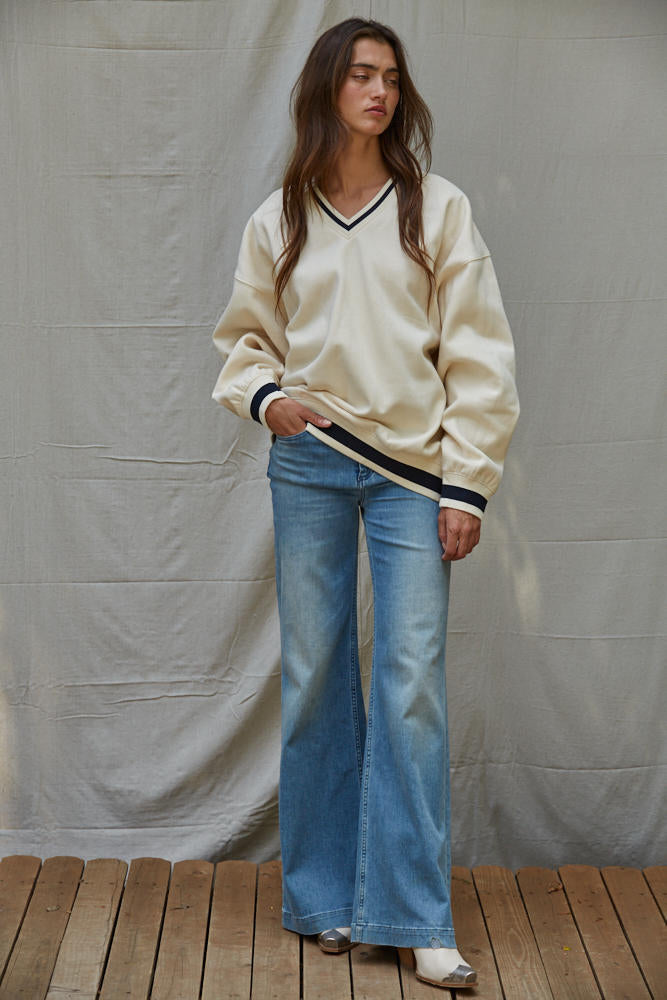 Knit Polyester Cotton V-Neck Long Sleeve Oversized Pullover Top With Stripe Contrast Ribbed Trim Detail