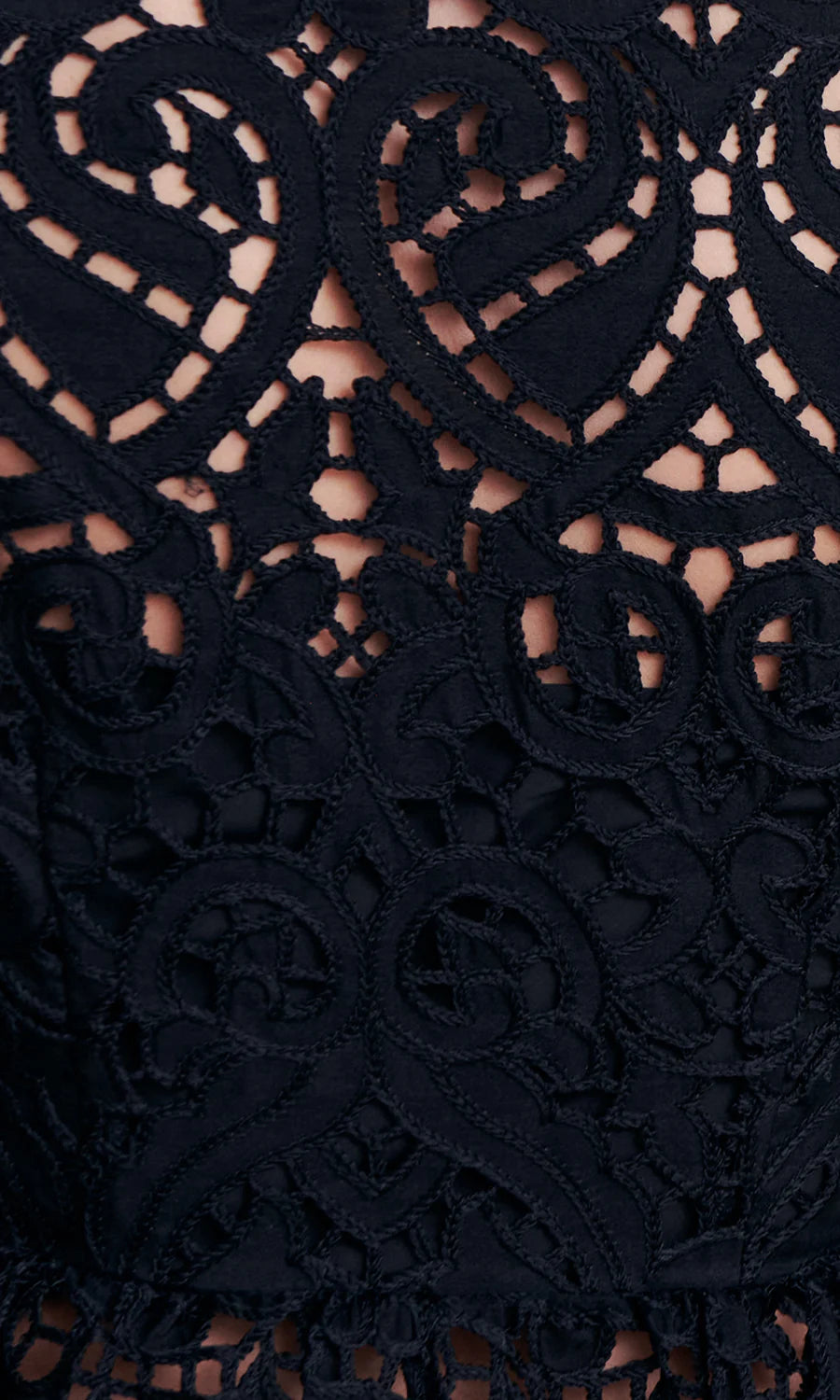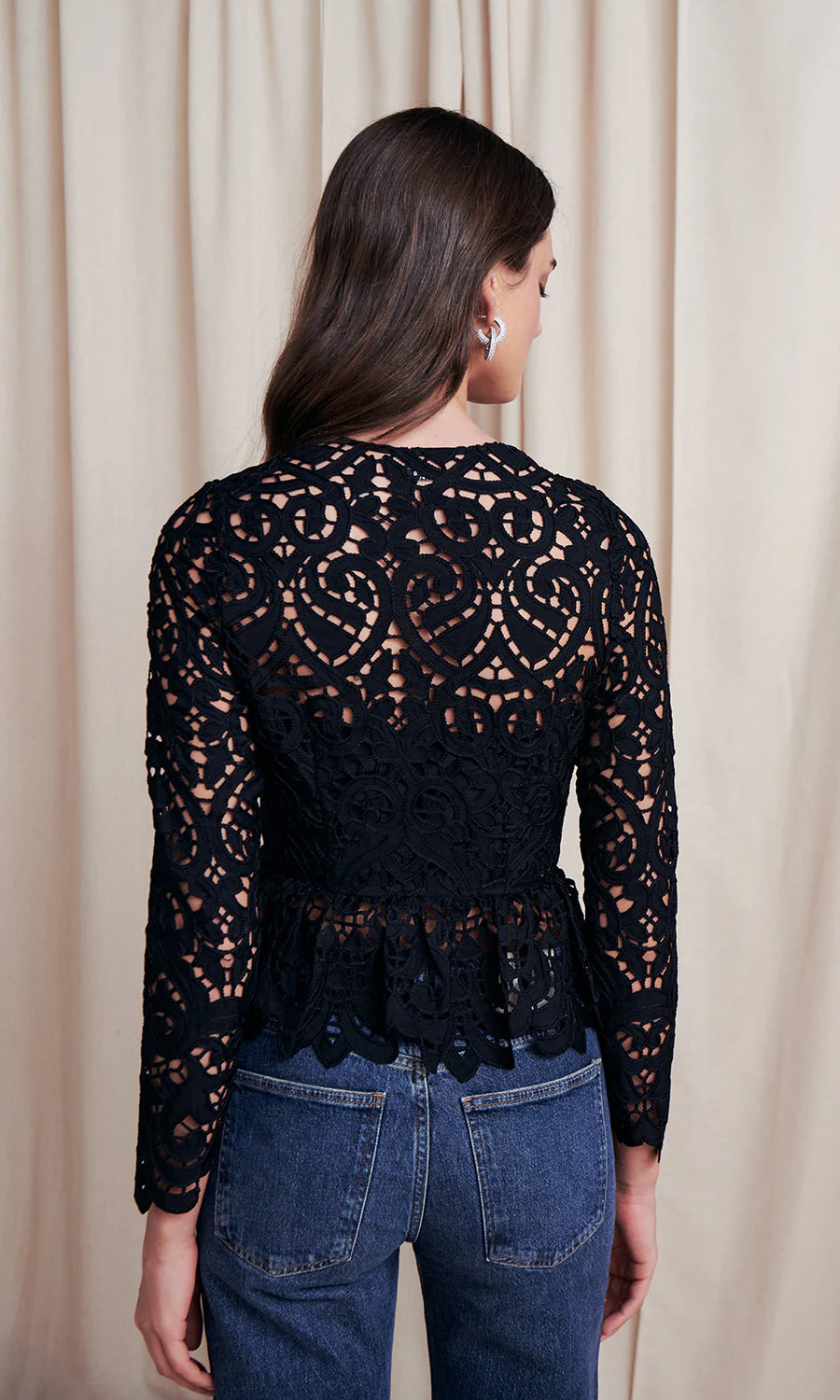 Peplum please! Our peplum Alva top is made from black intricate embroidered lace with a beautiful swirl pattern. The long sleeve top has gold buttons down the center front. The standout top pairs perfectly with jeans or leather trousers for a chic fall look.