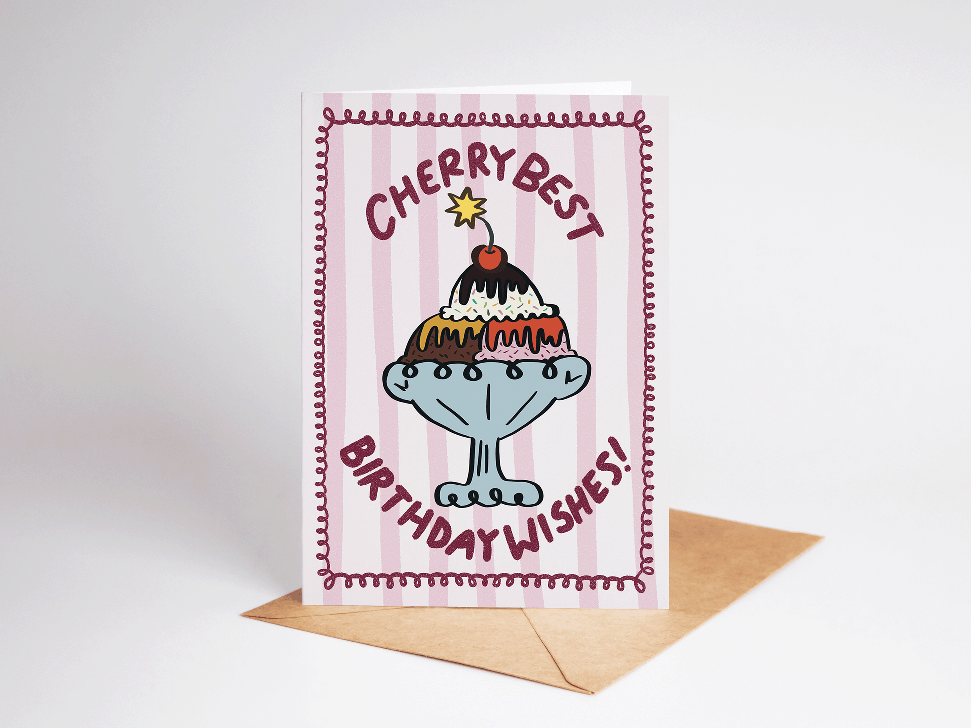 Give a sweet lil birthday wish with this eye-catching 5x7 birthday card, featuring a delicious ice cream sundae in a retro-style illustration and the phrase "cherry best birthday wishes!" The card is blank inside for your own personal message, and comes with a brown kraft envelope. Perfect for celebrations, dessert lovers, birthdays, congratulations, foodies, and more!