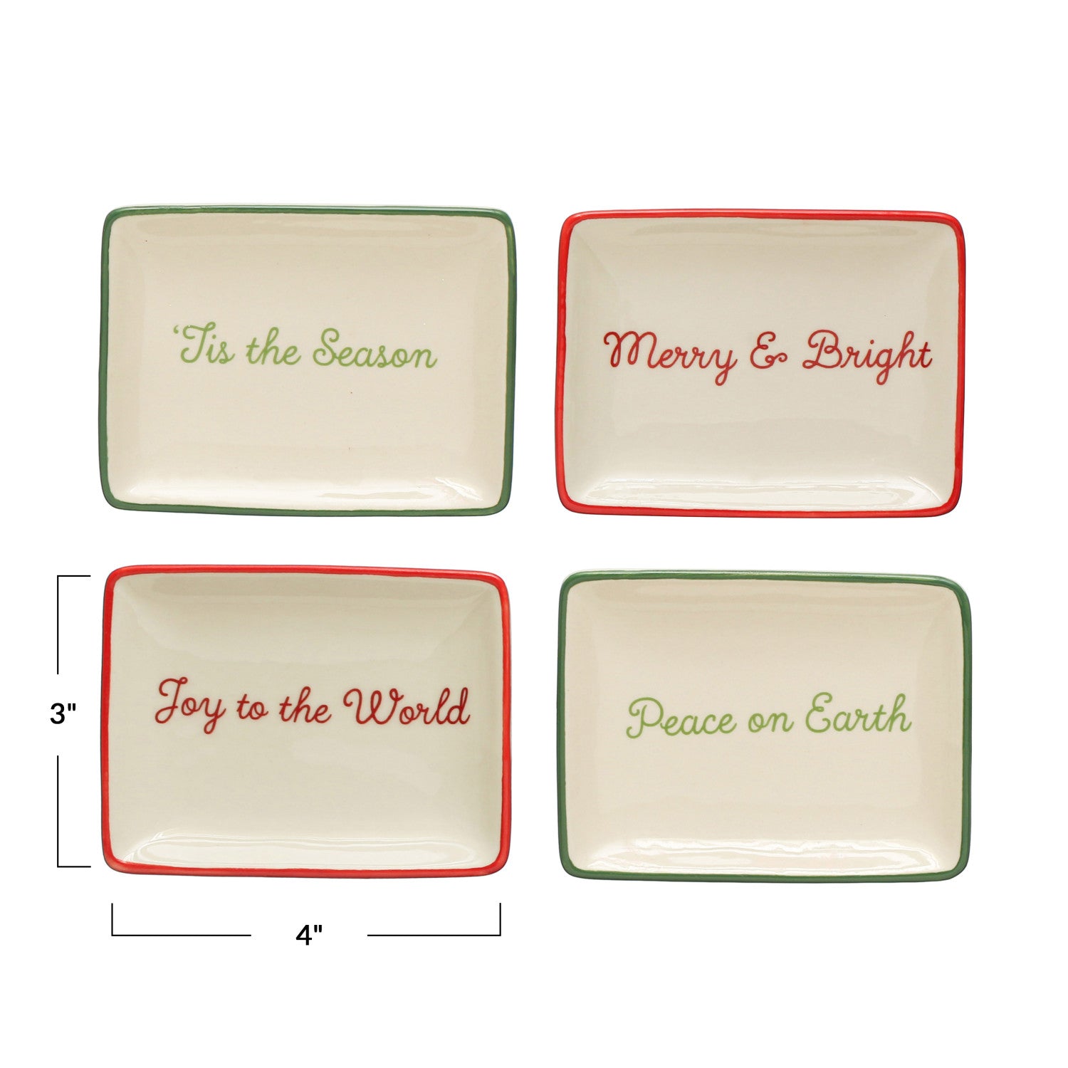 4"L x 3"W Stoneware Dish w/ Holiday Words & Red/Green Rim, Cream Color, 4 Styles