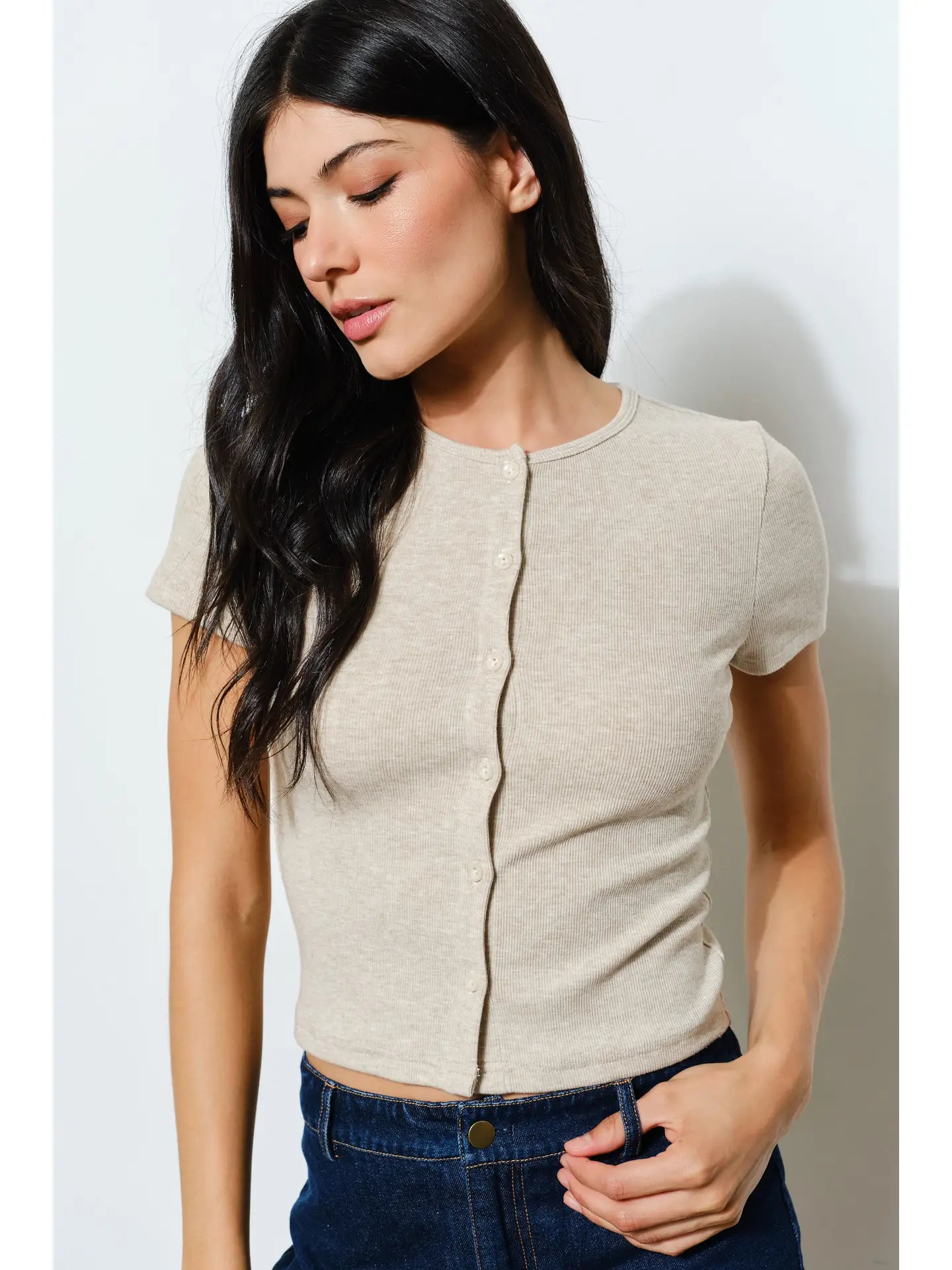 Model is 5'8" and wearing a size small. Fabric: 76% Polyester, 19% Acrylic, 5% Spandex Keywords: ribbed button up tee, short sleeve knit top, trendy women's tee, wholesale women's clothing, everyday basic, playful ribbed shirt, button up top, youthful style
