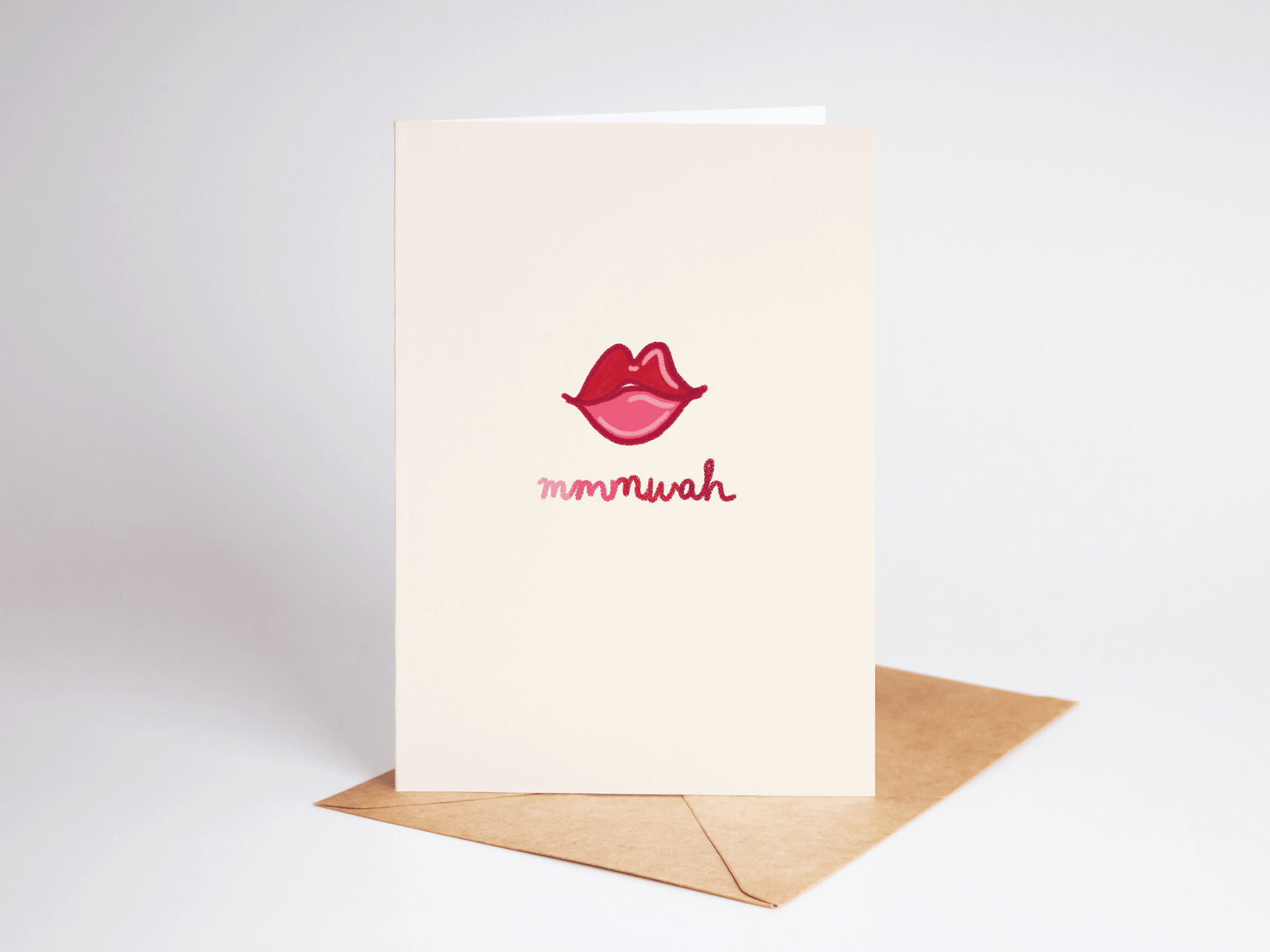 Send a kiss to someone you miss with this adorable 5x7 card, featuring a puckered-up pout of pink and red lips along with the word, "mmmwah". The card is blank inside for your own personal message, and comes with a brown kraft envelope. Perfect for significant others, anniversaries, weddings & engagements, Valentine's Day, and more!