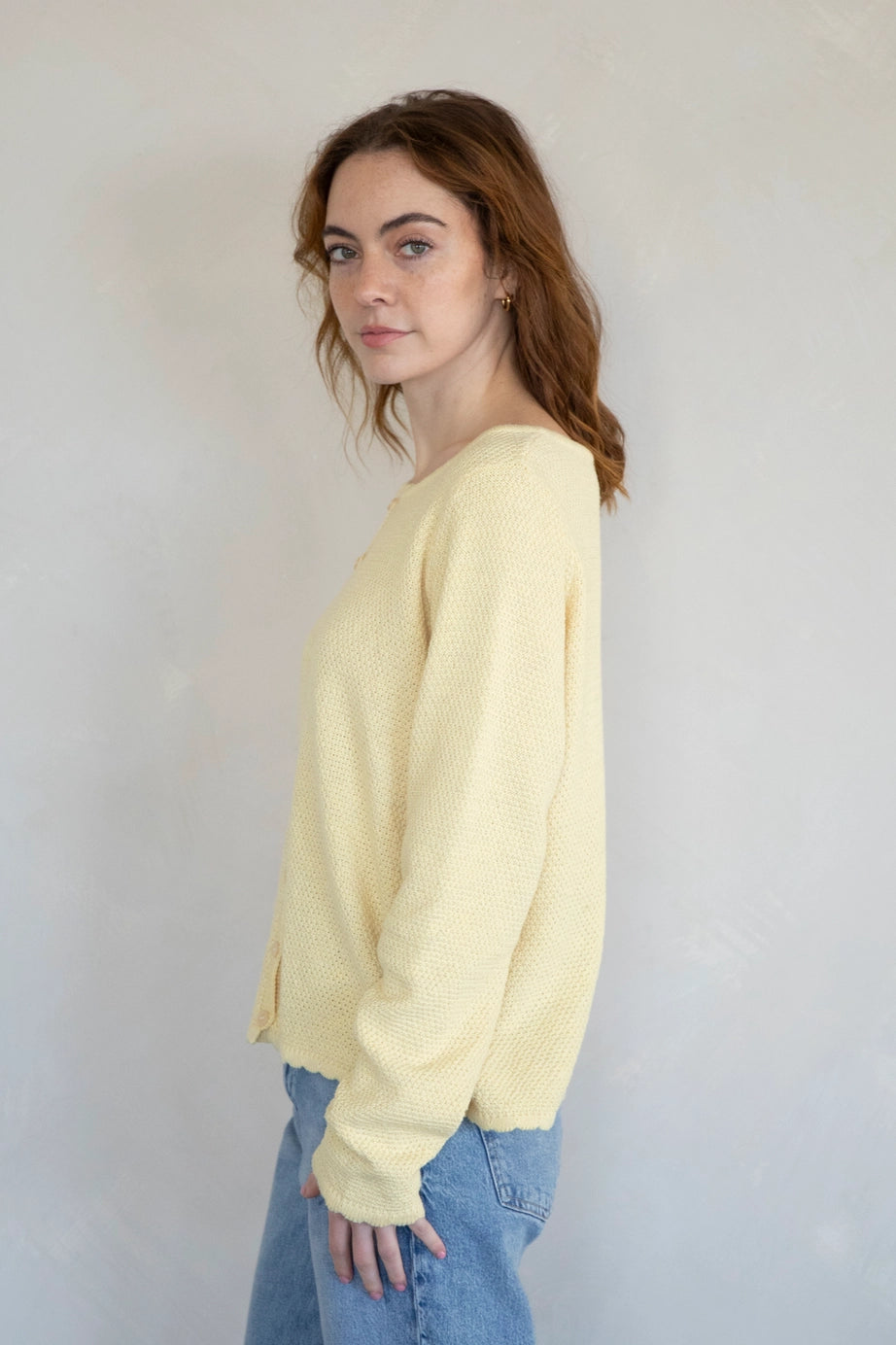 Cozy knit cardigan with scalloped edge details.