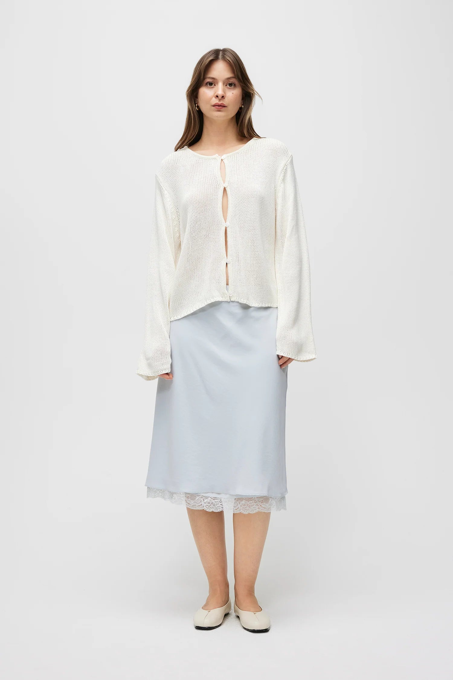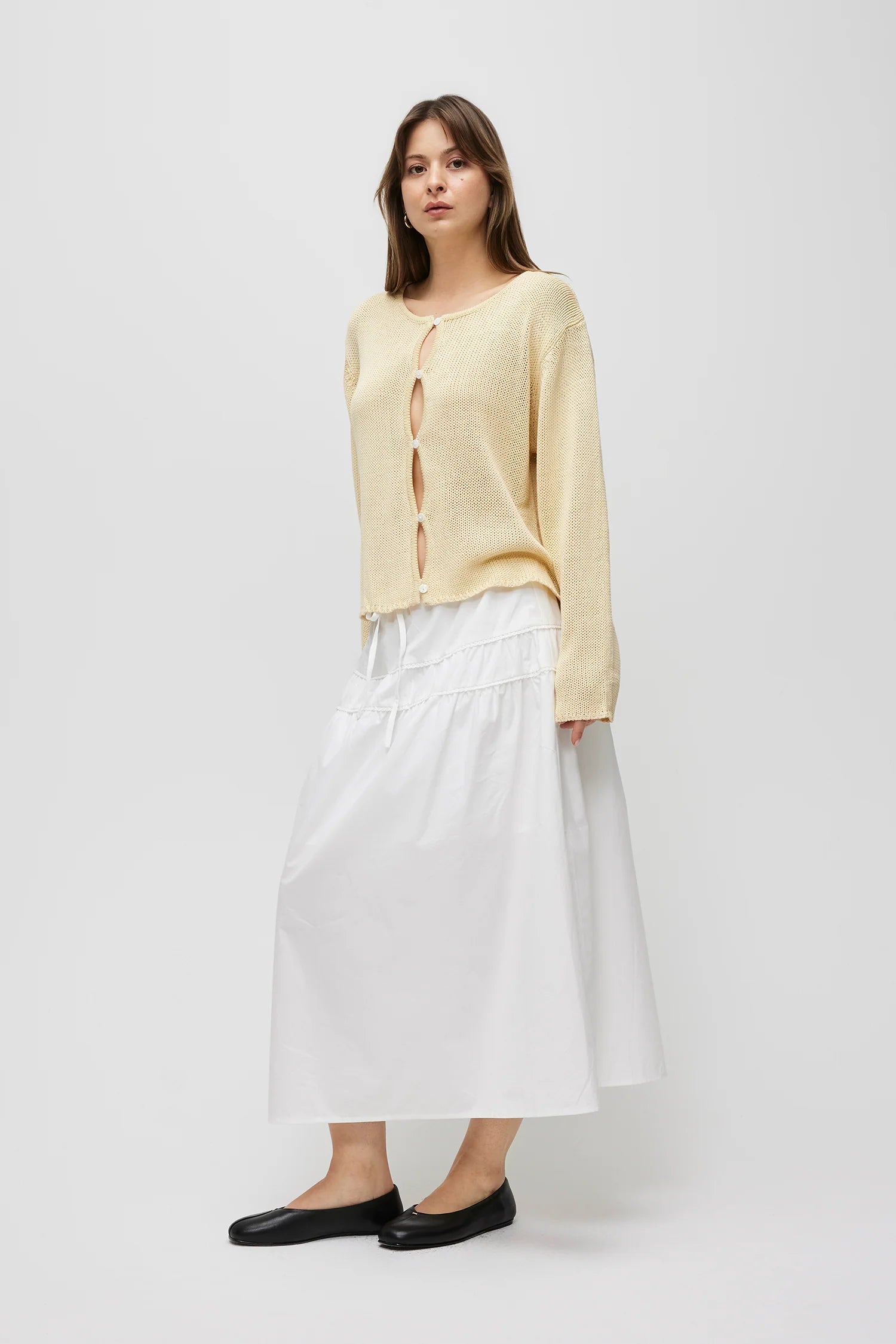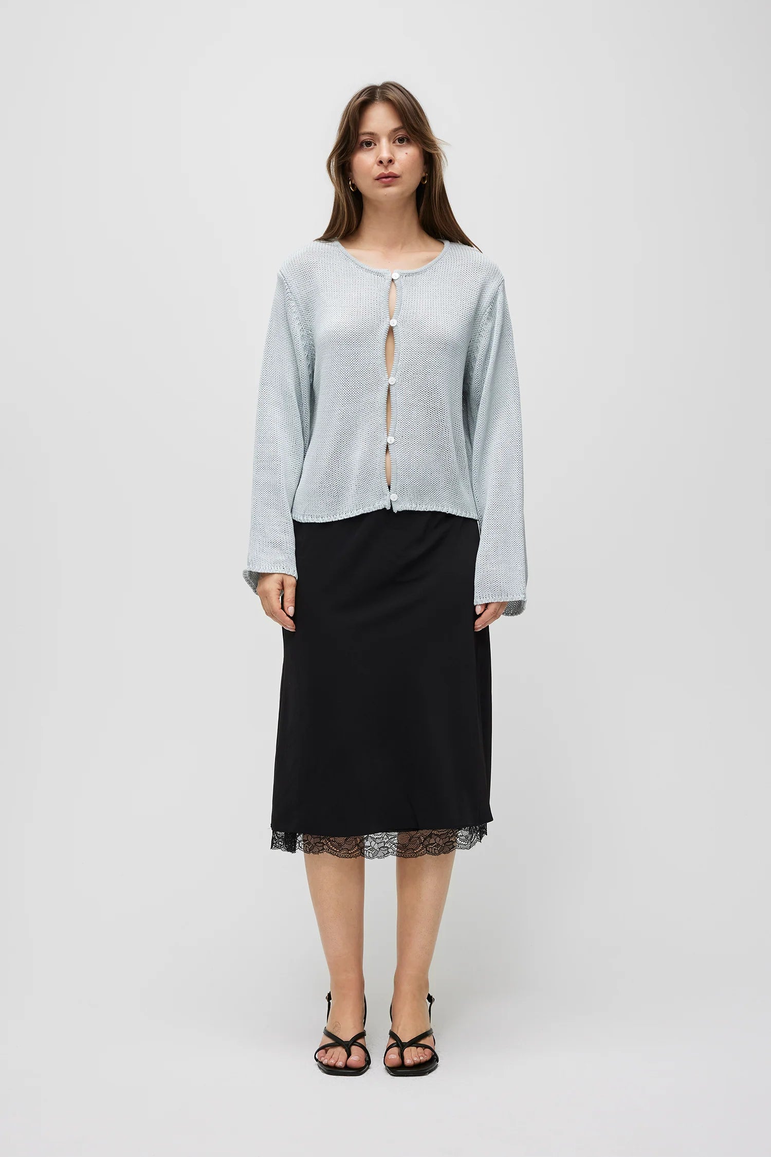 The Carolyn Cardigan is made from low-gauge knit with a relaxed fit. It has a wide neckline, long sleeves, and a full front button closure with open detailing.