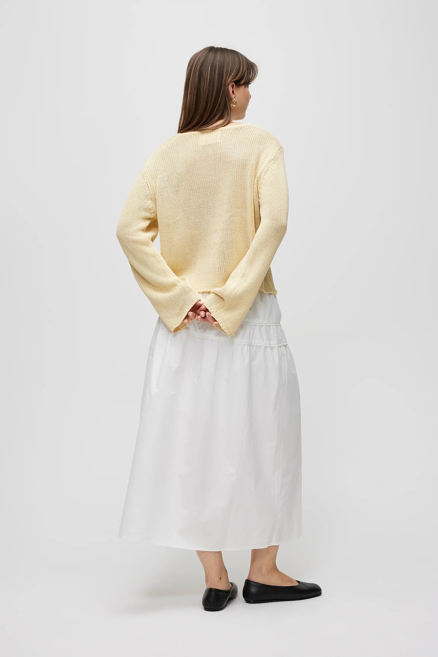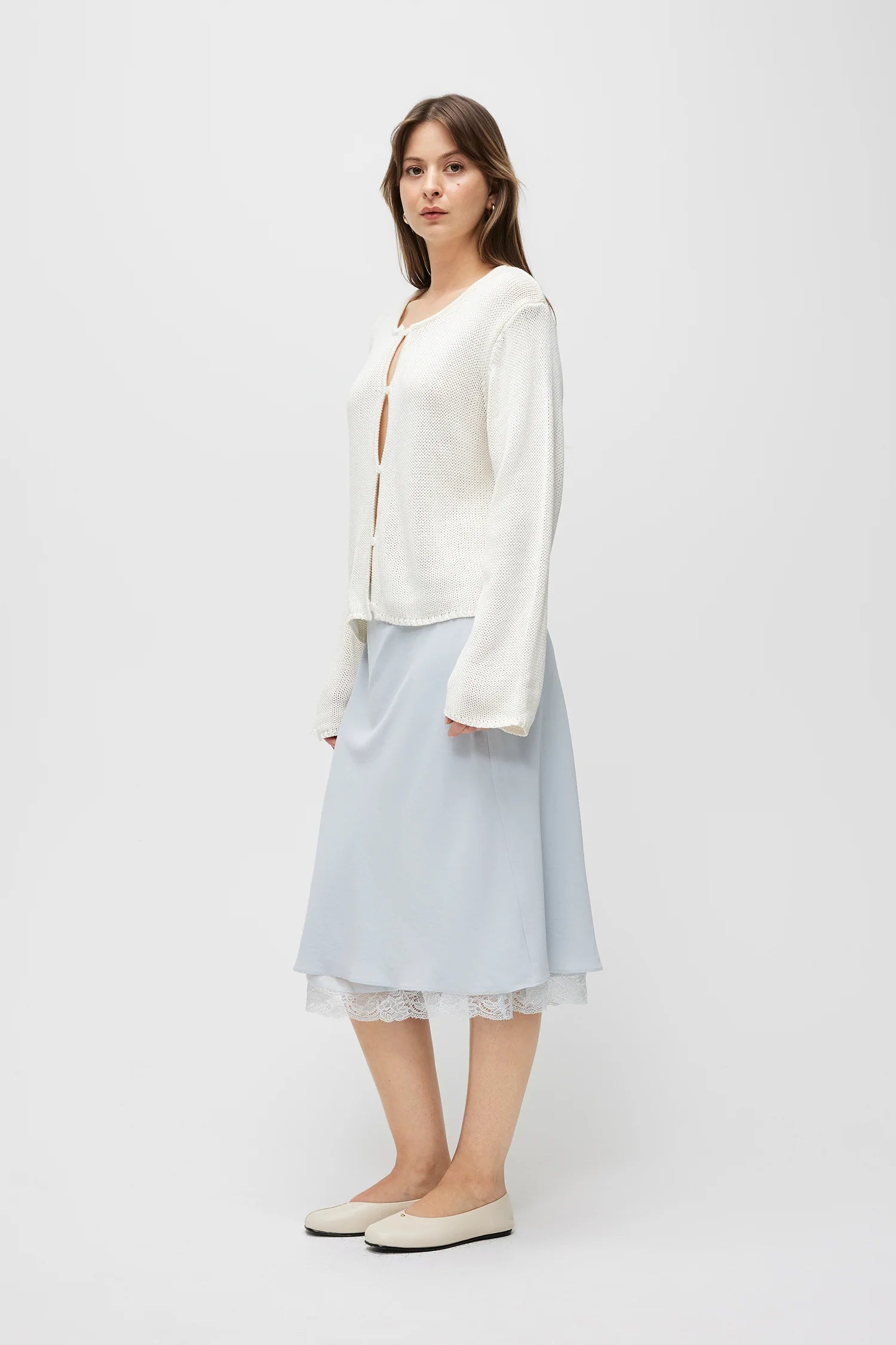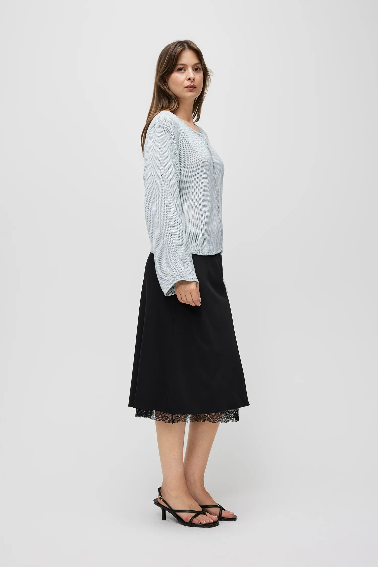 The Carolyn Cardigan is made from low-gauge knit with a relaxed fit. It has a wide neckline, long sleeves, and a full front button closure with open detailing.