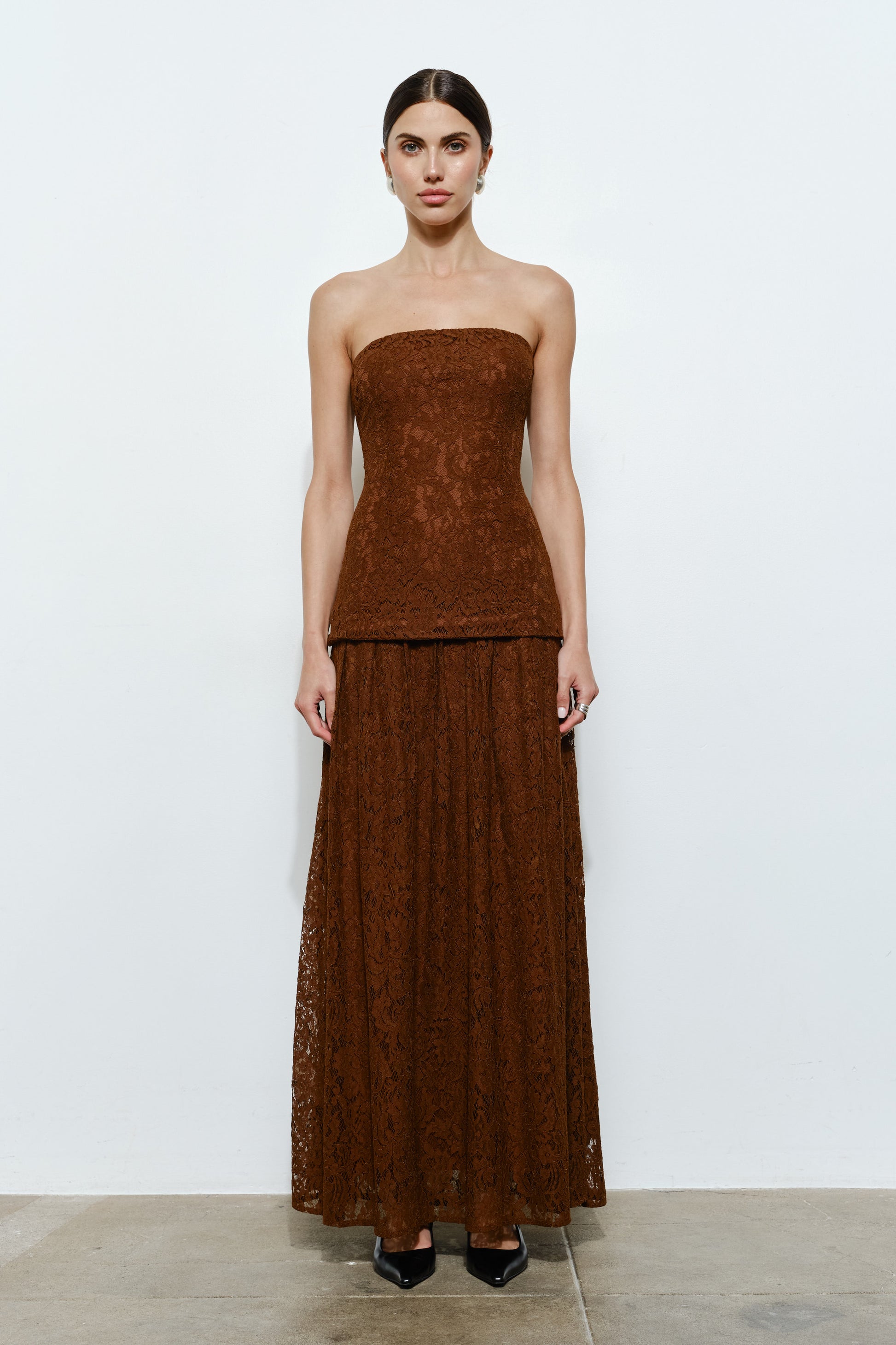 Lace, Strapless maxi dress, long full skirt, fully lined, center back invisible zipper. S:60%RAYON 40%COTTON