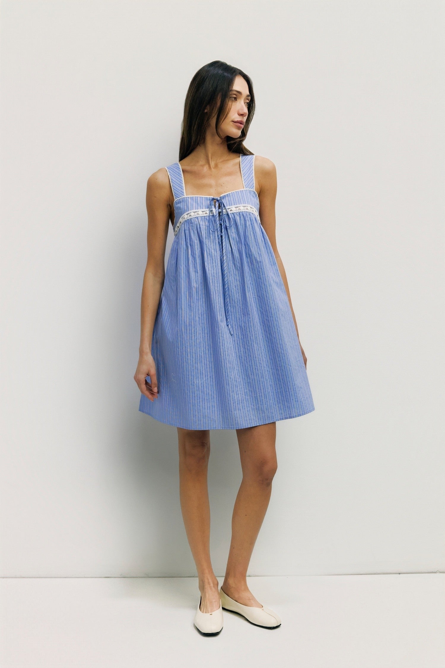 The Harper Dress is made from striped cotton poplin and fully lined. It has a loose, sleeveless babydoll fit with a square neckline, scallop trim along the neckline and straps, bust lace detailing, and a partial front button and tie closure at mini length.
