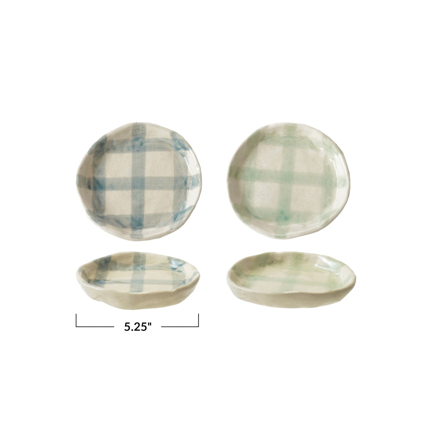 Hand-Painted Stoneware Plate w/ Grid Pattern, Reactive Glaze, 2 Colors (Each One Will Vary)