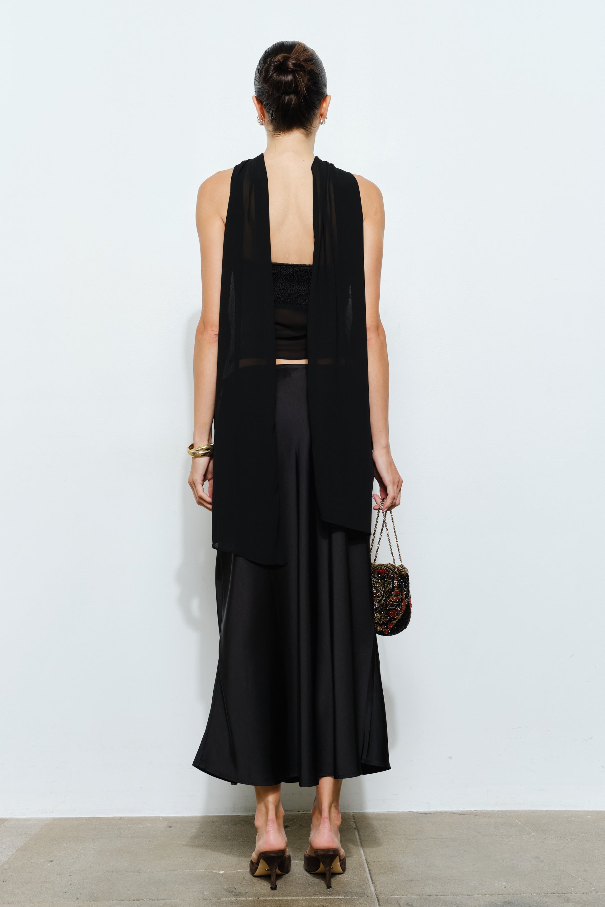Strapless satin tube top w/ sheer chiffon bodice and matching scarf. S: 45% Rayon, 55% Polyester